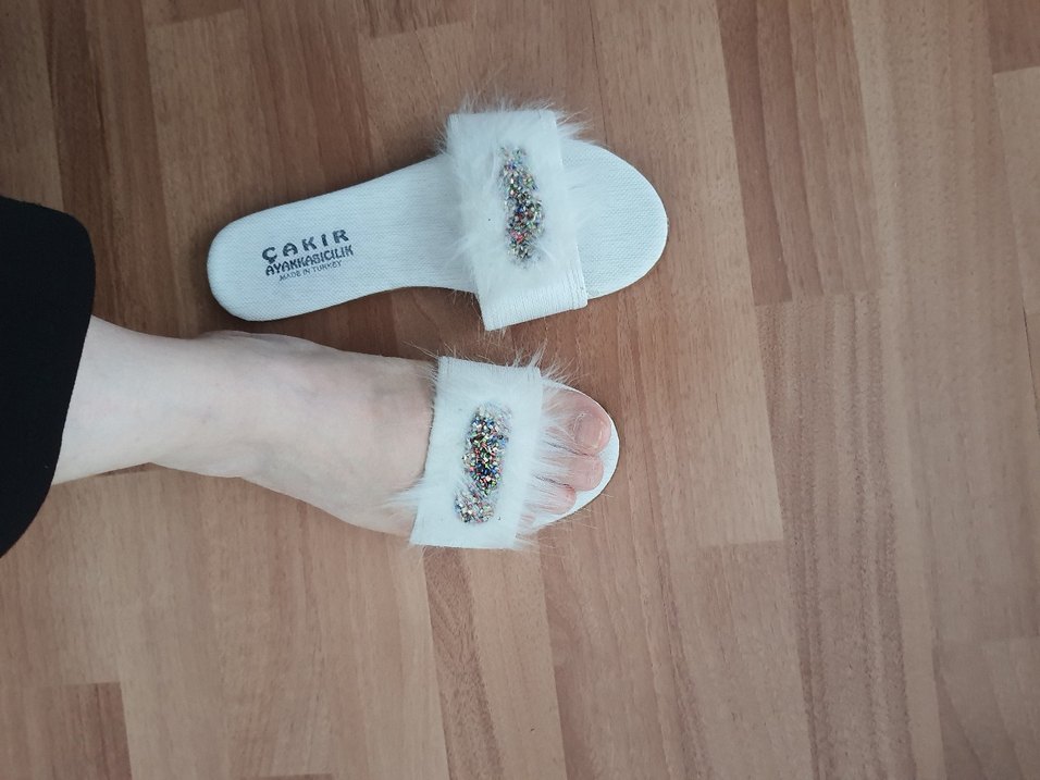 Beyaz, kürklü ve nakış detaylı, blok topuklu terlik. Kauçuk tabanlı, günlük kullanıma uygun bohem tarzda.