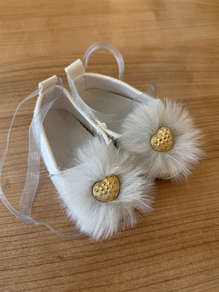 Beyaz örme kumaştan yapılmış, kürk detaylı ve işlemeli parlak kalp süslemeli kız babetleri, klasik ve geleneksel tarzda.