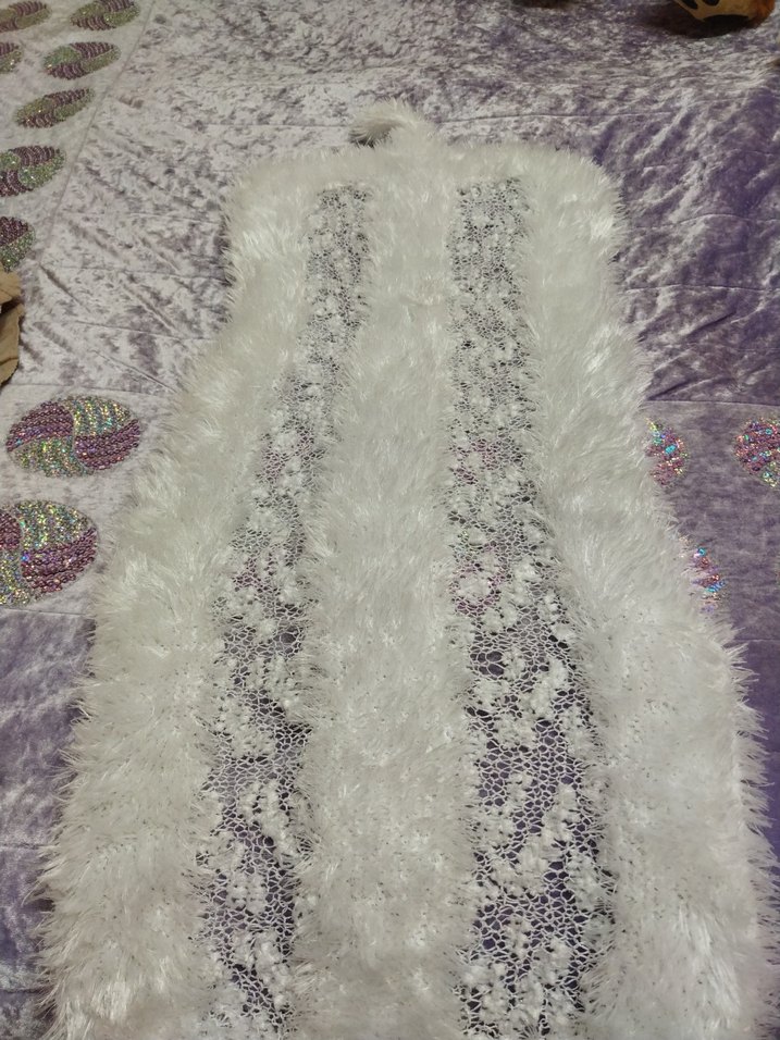 Beyaz ve gri nakışlı desenlere ve kürk detaylarına sahip, sentetik kumaştan yapılmış, uzun, bohem tarzda, tekne yaka ve kolsuz, vücuda oturan yelek.
