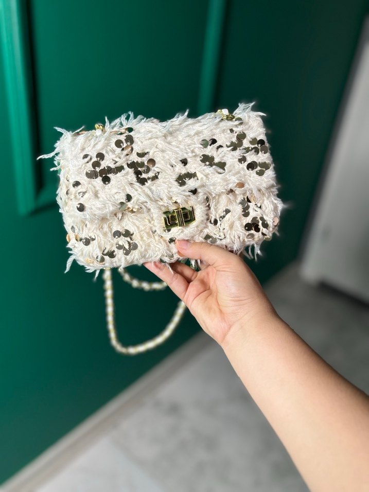 Beyaz örgü kumaştan yapılmış, kürk detaylı ve hafif yılan desenli bohem tarzda kadın çantasıdır. Zincir askılı ve günlük kullanıma uygundur.
