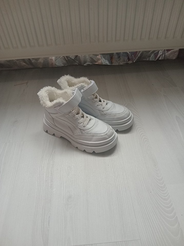 Yumuşak kürk astarlı, platform topuklu beyaz kız spor ayakkabısı. Rahat kullanım için kauçuk tabanlı, trend sokak stiline uygun.35 no