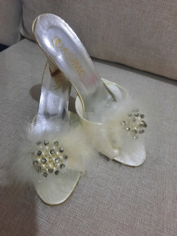 Parlak sentetik kumaştan, kürklü ve taşlı detaylara sahip beyaz stiletto topuklu gelin terliği.