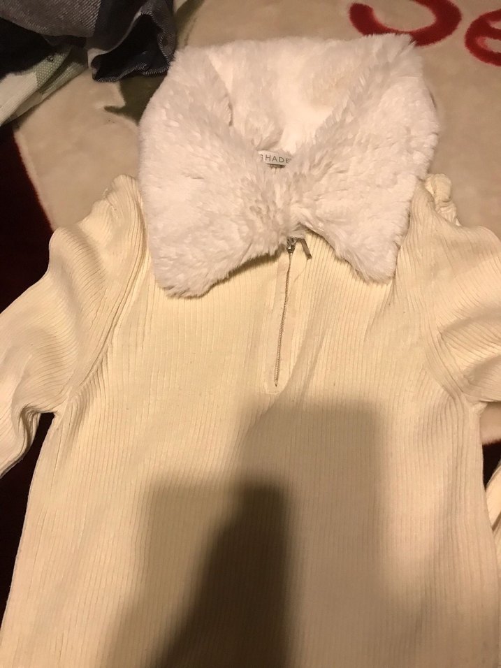 Beyaz, kürklü yakaya sahip, uzun kollu ve vücuda oturan sıcak dokulu kadın kazak. Günlük kullanıma uygundur. ❄️