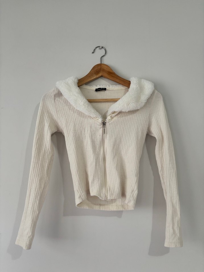Beyaz, uzun kollu, yakasında kürk detaylı, ince kumaştan yapılmış, normal uzunlukta ve fermuarlı, sokak modasına uygun, rahat kesim kadın kazak.