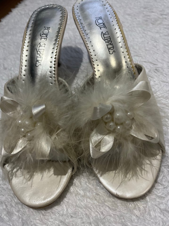 Sentetik kumaştan, inci ve kurdele detaylı kürklü beyaz yüksek topuklu kadın terlik. Bohem düğün tarzına uygun. Ben 38 giyiyorum 38 giyene de olur