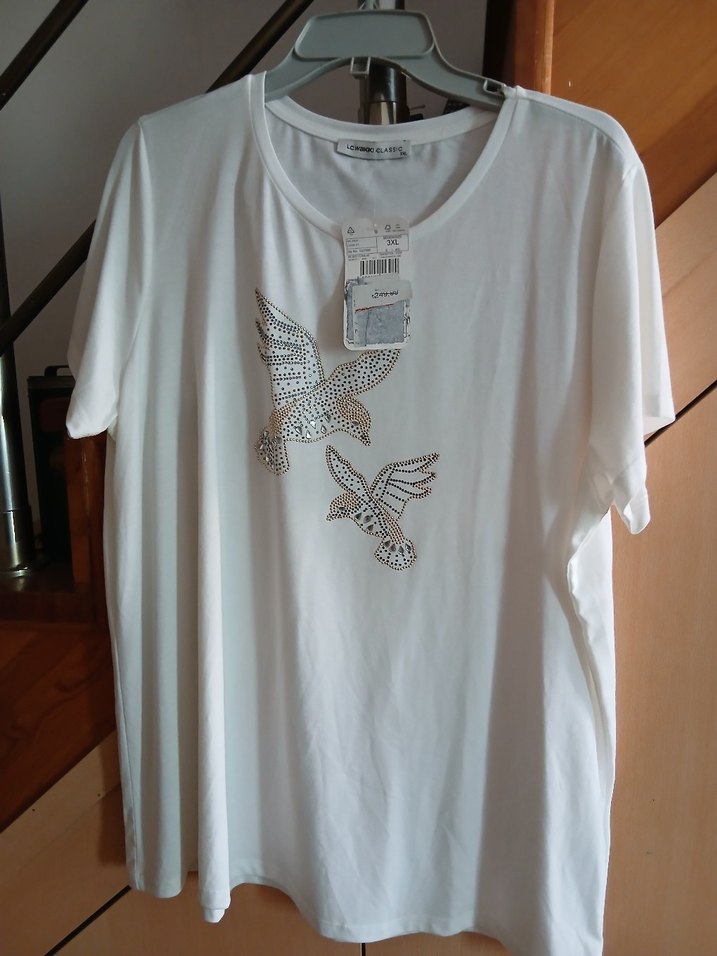 Pamuklu beyaz kısa kollu, yuvarlak yaka kadın tişörtü. İki kuş baskısı ile gündelik kullanıma uygun, rahat ve şık bir görünüm sunar. ️