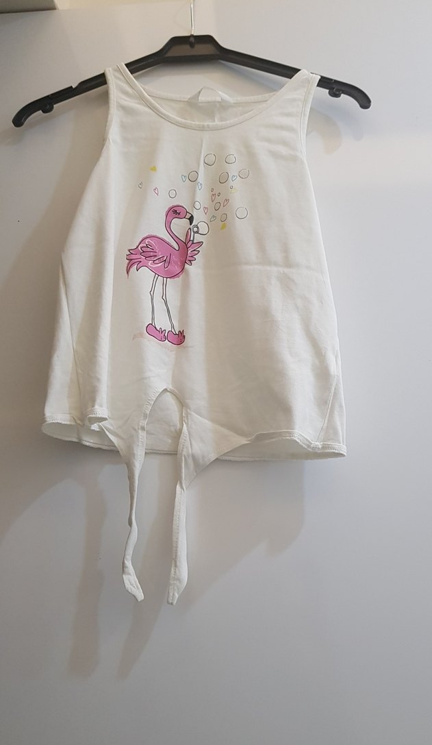 Kolsuz, beyaz kız tişörtü, straplez yaka ve bol kesim. Flamingo baskılı, uç kısmında fırfır ve bağcık detaylı, yumuşak sentetik kumaştan yapılmıştır.