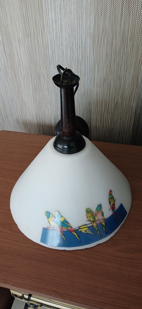 Kenarında renkli kuş desenleri bulunan geniş beyaz tavan lambası. Koyu renk tutucuya sahip ve yumuşak ışık verir. ️
