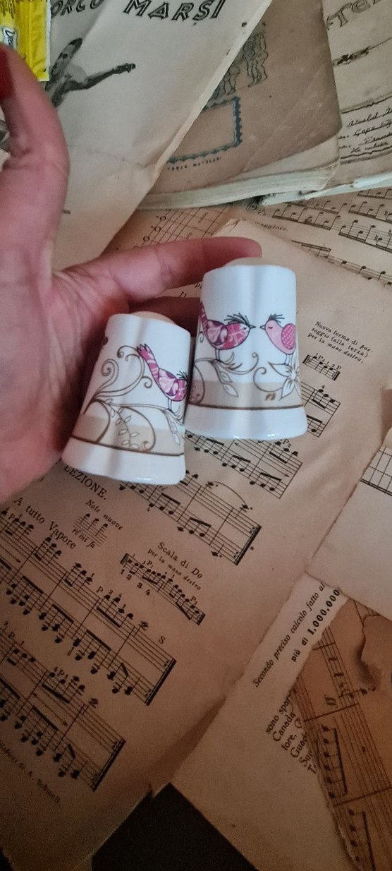 Renkli kuş desenleriyle süslenmiş beyaz tuzluk ve biberlik seti. Kompakt boyutta, mutfakta kullanıma uygun.