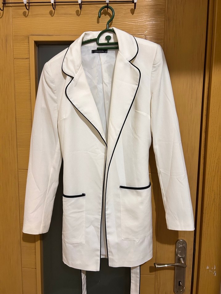 Beyaz, kuşaklı kadın blazer ceket, uzun kollu ve normal kesimdir. Trendyolmilla marka ablamındı görüldüğü gibidir