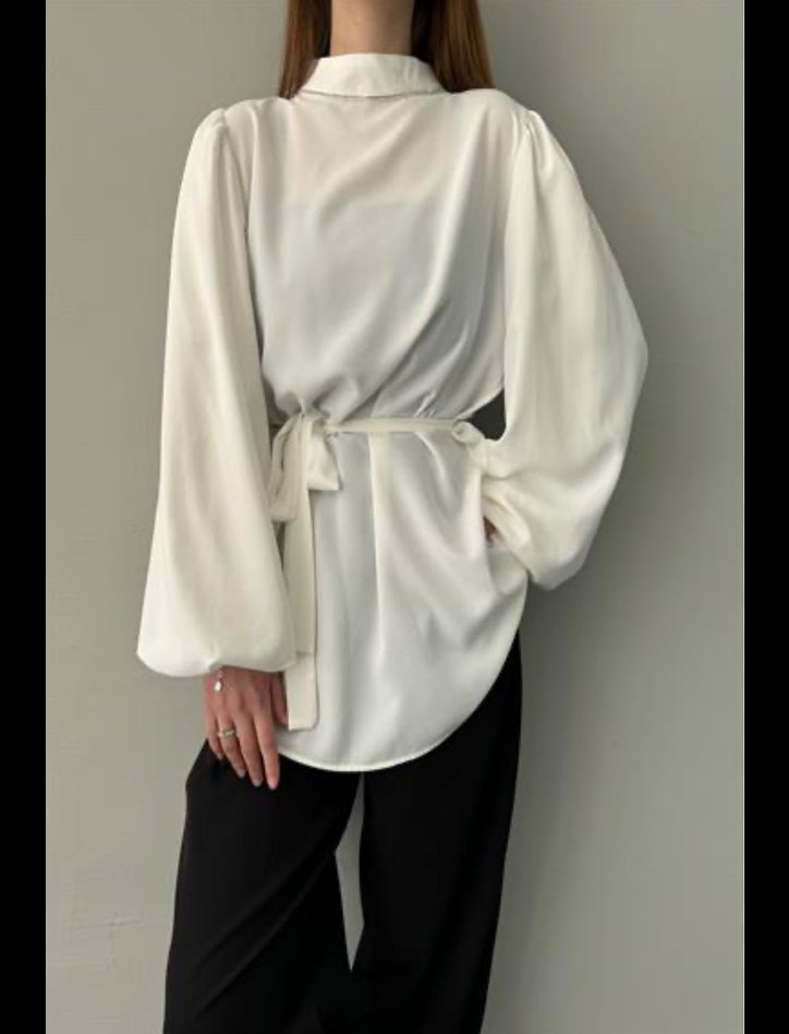 Beyaz, yüksek yakalı taşlı kuşaklı tunik uzun ve bol kolludur. İpek gibi kumaştan yapılmış, kuşaklı ve midi boyda, şık ve rahat bir ofis görünümü sunar. ✨
