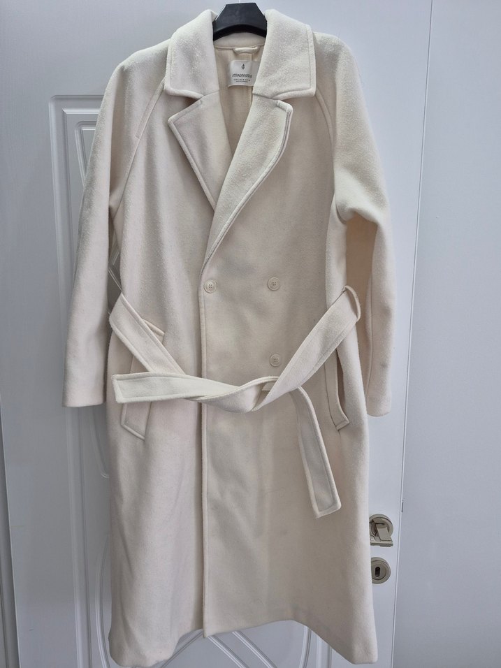 Beyaz uzun kadın kaban, kuşaklı ve kesik yakalıdır. Yumuşak ve sıcak kumaştan, ofis için klasik şıklık sunar.