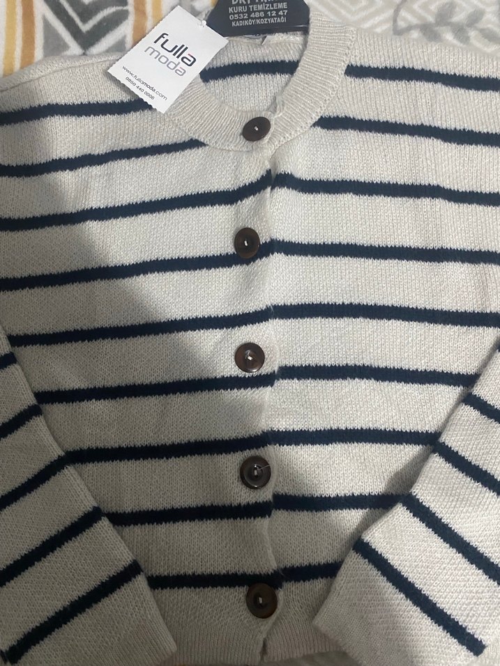 Yumuşak yün kumaştan, düğmeli ve uzun kollu, beyaz lacivert çizgili, salaş kesim kadın hırka. Günlük rahat kullanım için uygundur.