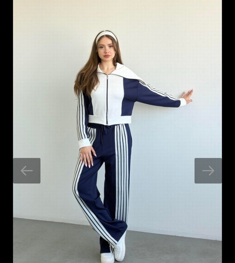 Yüksek yakalı ve uzun kollu, regular fit kadın eşofman takımı. Beyaz ve lacivert çizgili deseniyle, sentetik kumaştan üretilmiştir. Spor için rahat ve şık tasarım. ♀️