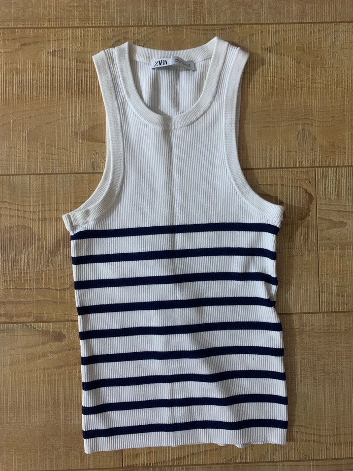Beyaz ve lacivert çizgili, triko dokulu, kolsuz ve vücuda oturan kadın atlet, günlük kullanım için uygundur.