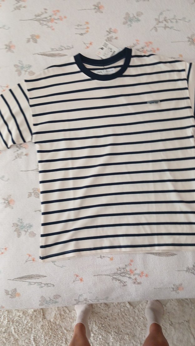 pamuklu, kısa kollu, bisiklet yaka ve bol kesimli beyaz-laxivert çizgili tişört. Günlük kullanıma uygun rahat sokak stili.