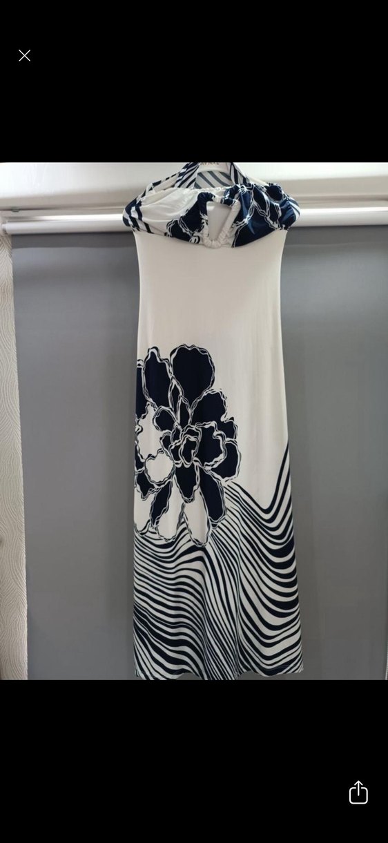 Drapeli yakalı, straplez, vücuda oturan uzun elbise. Lacivert beyaz baskılı, pürüzsüz sentetik kumaştan yapılmıştır. Günlük kullanım için uygundur.
