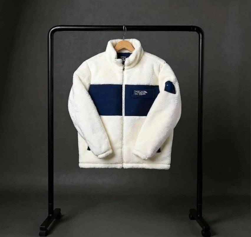Notch yakalı, fermuarlı erkek polar ceket. Beyaz ve lacivert renklerde, baskılı detaylarla günlük kullanıma uygun regular kesim uzun kollu model. ❄️