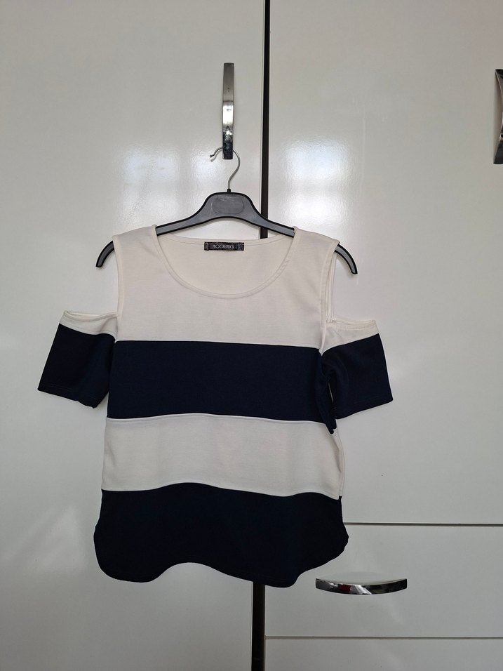 kısa kollu kadın bluz. Beyaz zemin üzerine lacivert çizgili , rahat sokak stili için uygundur.