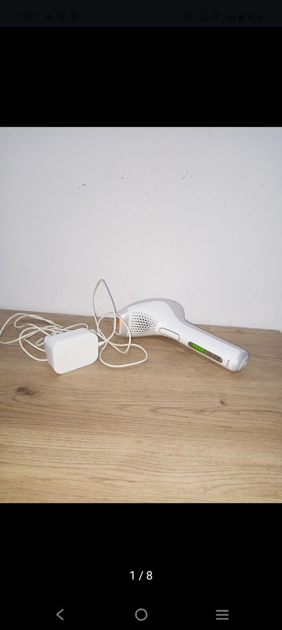 Beyaz lazer epilasyon cihazı, elde taşınabilir tasarıma ve kullanım kolaylığı için güç adaptörüne sahiptir. Ayarları gösteren dijital ekran bulunur. ⚡