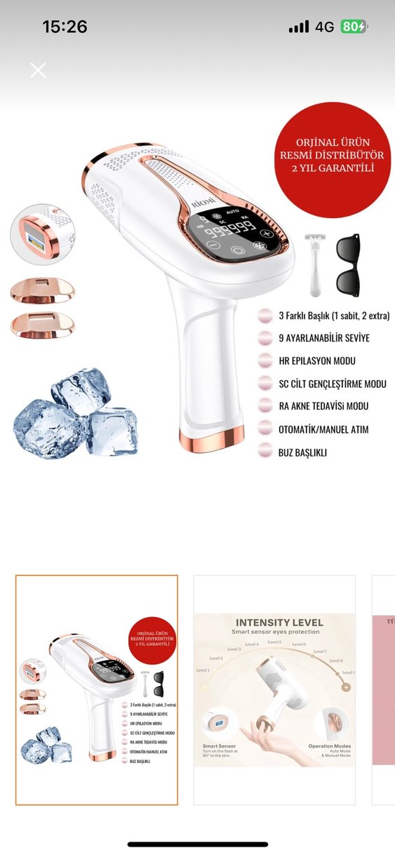 Beyaz lazer epilasyon cihazı, 3 başlık, 9 ayarlanabilir seviye, epilasyon, cilt gençleştirme ve akne modları sunar. Buz başlıklı, otomatik/manuel kullanım ve 2 yıl garanti içerir. ❄️