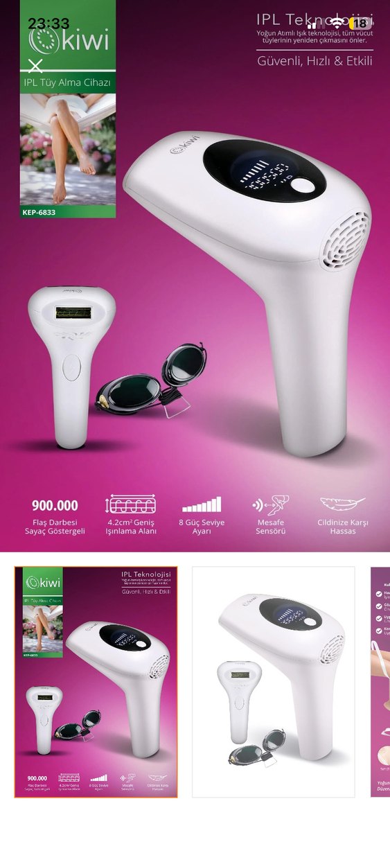 Beyaz lazer epilasyon cihazı KEP-6833, 900.000 flaş darbesi, 4.2 cm² geniş ışınlama alanı, 8 güç seviyesi ve mesafe sensörü ile cilde hassas kullanım sağlar. Koruyucu gözlük dahildir.✨Detaylı bilgi için yazabilirsiniz