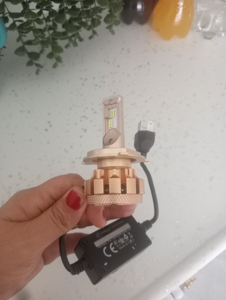 Beyaz LED araç farı ampulü, kompakt tasarımlı ve güç adaptörlü. Araç kullanımı için parlak ışık sağlar.