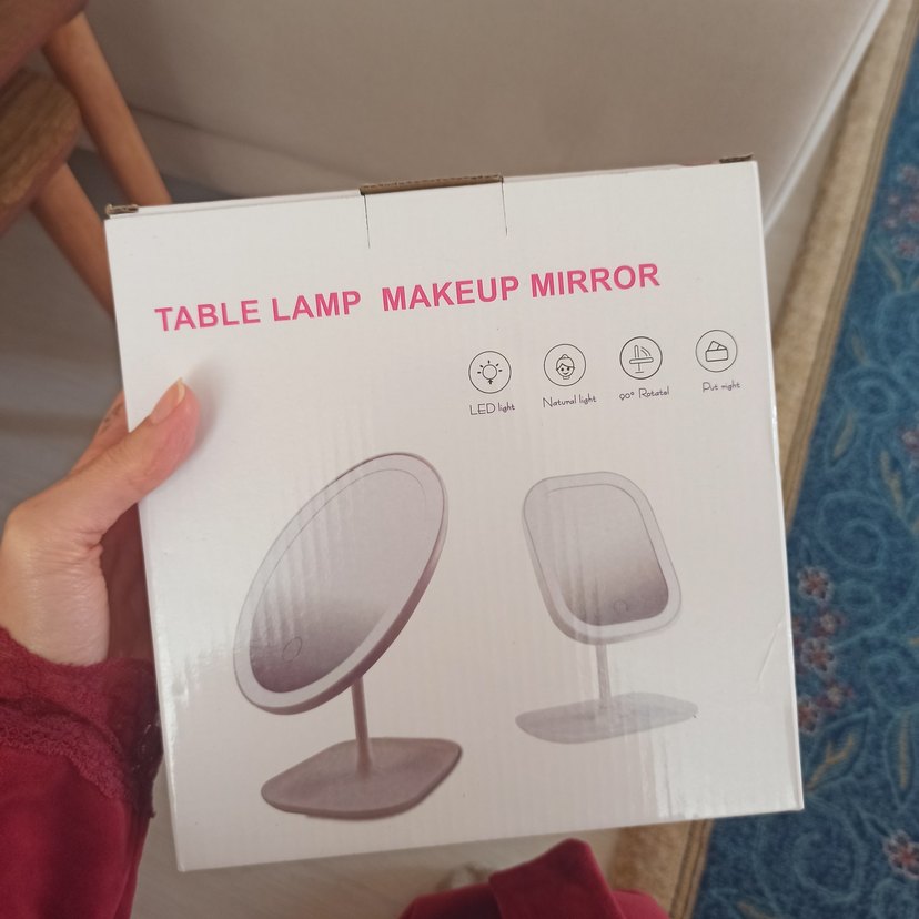 Beyaz masaüstü makyaj aynası, LED ışık ve doğal ışık sağlar, açısı ayarlanabilir ve detaylı görüş için uygundur.