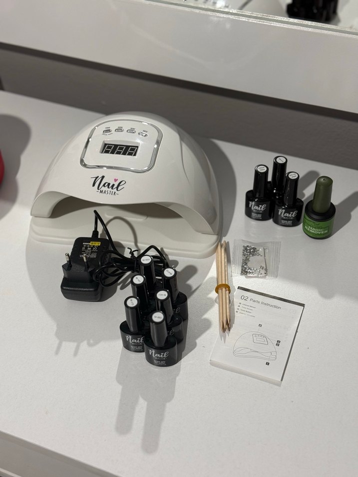 Beyaz LED tırnak kurutucu seti, çeşitli oje şişeleri, ahşap tırnak eti çubukları ve adaptör içerir. Sadece bir kere denemek icin kullandım. Yanında ojeleri de hediye ediyorum..