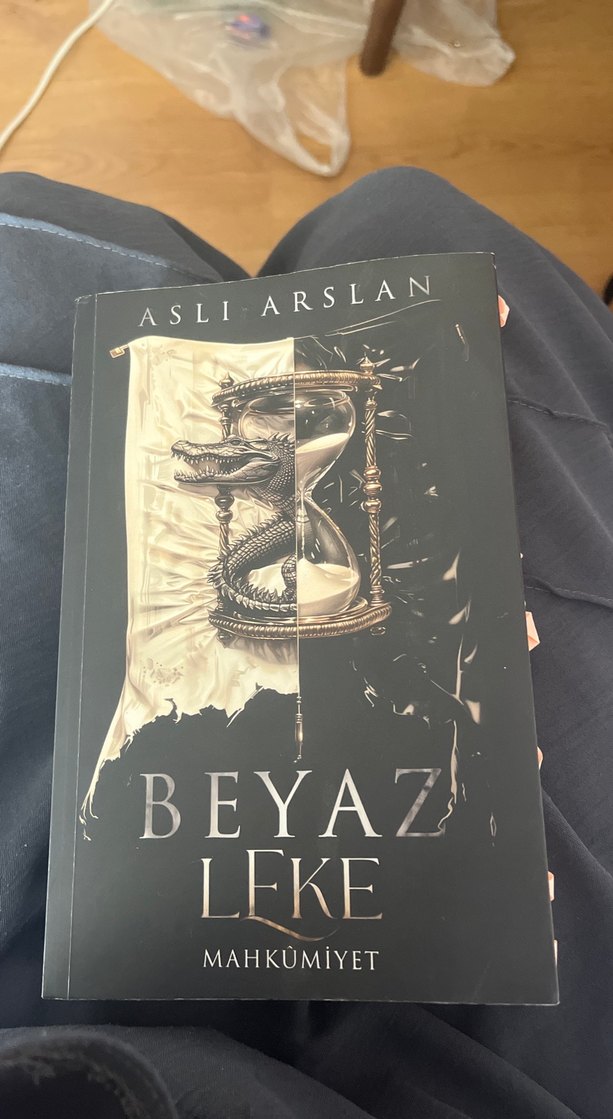 Aslı Arslan'ın "Beyaz Leke Mahkumiyet" adlı romanı, suçluluk ve sonuç temalarını işler. Kapağında detaylı bir kum saati resmi bulunur.