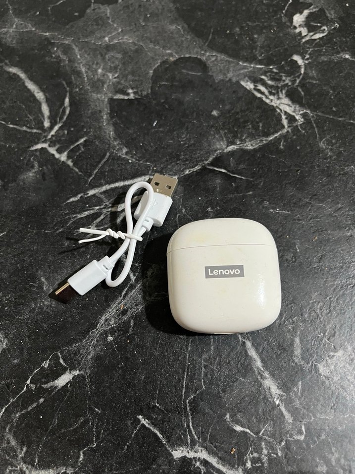 Şarj kutusu ve USB kablosu ile beyaz Lenovo kablosuz kulaklık. Sorunsuz