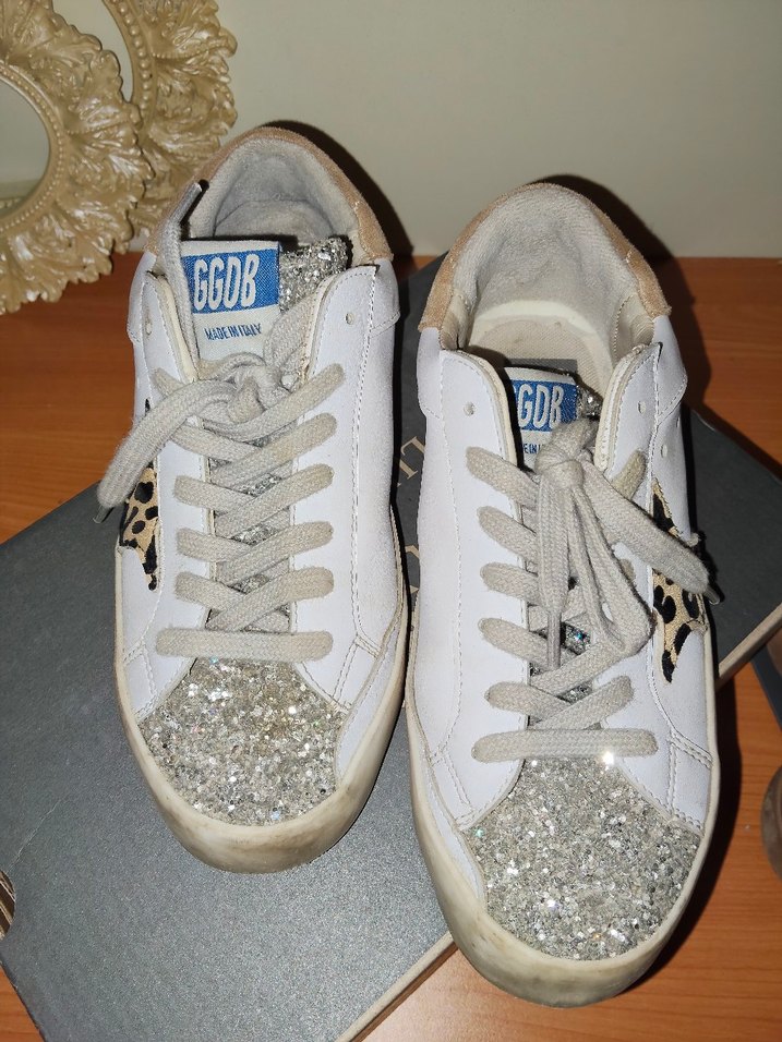 Beyaz, payetli burunları ve leopar desenli detayları olan, yüksek kauçuk topuklu sneakers. Günlük sokak stili için uygundur. cok az kullanıldı 1.sınıf replika