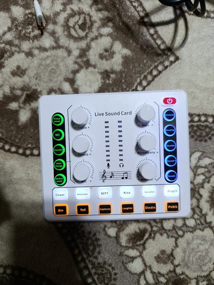 Çoklu düğme ve ayar kadranlarına sahip beyaz Live Sound Card mikrofon kontrol ünitesi. efek mikrofon paneli ürün sarjlı kabloları mevcut