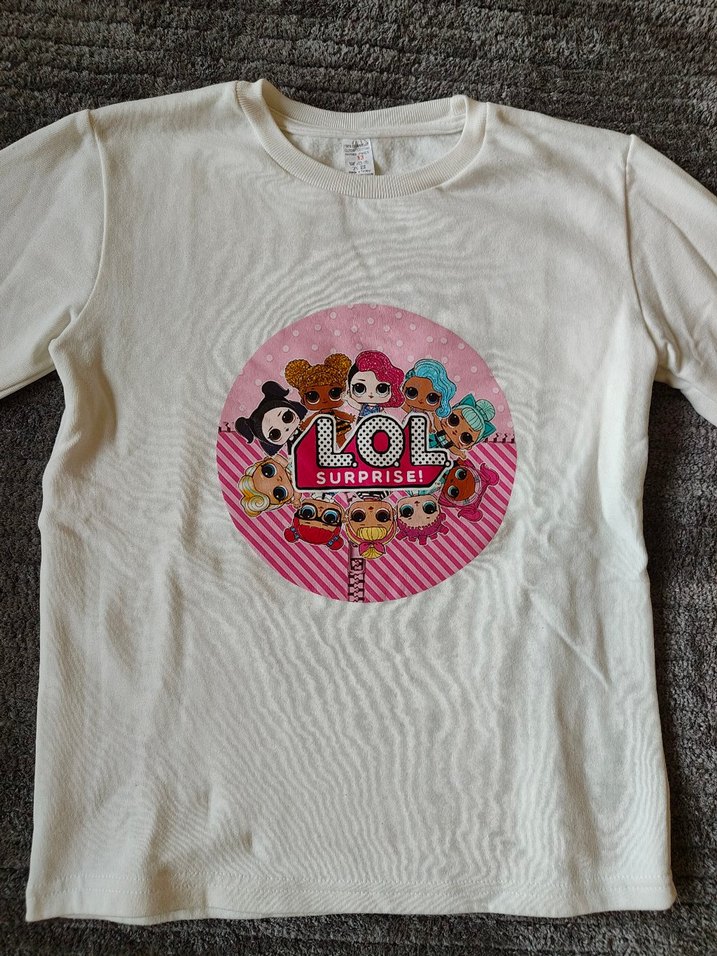 Beyaz pamuklu, kısa kollu, yuvarlak yaka kız sweatshirt ü. 10 yaş içindir. Lekesiz, hasarsız ve söküksüzdür. Renknkli LOL Surprise baskısı ve düğme detayı vardır. Rahat bol kesim.