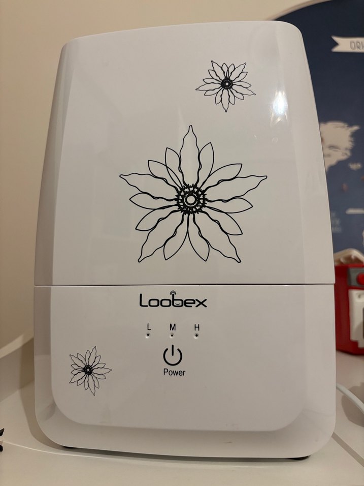 Çiçek desenli beyaz Loobex hava temizleyici ve nemlendirici, ayarlanabilir L, M, H seçenekleri ve kolay kullanım için güç düğmesi içerir.