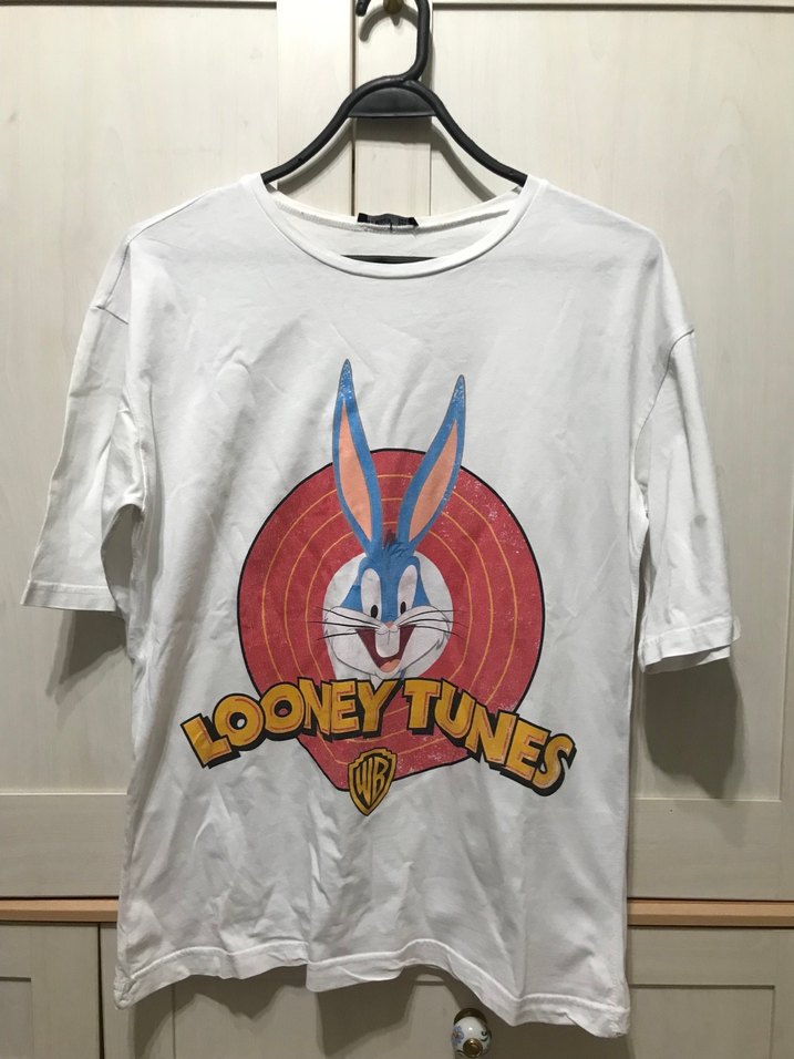 Beyaz pamuk tişört, kısa kollu ve bisiklet yaka tasarımıyla bol kesimdir. Önünde renkli Looney Tunes baskısı bulunur, günlük rahatlık ve sokak stili sunar.