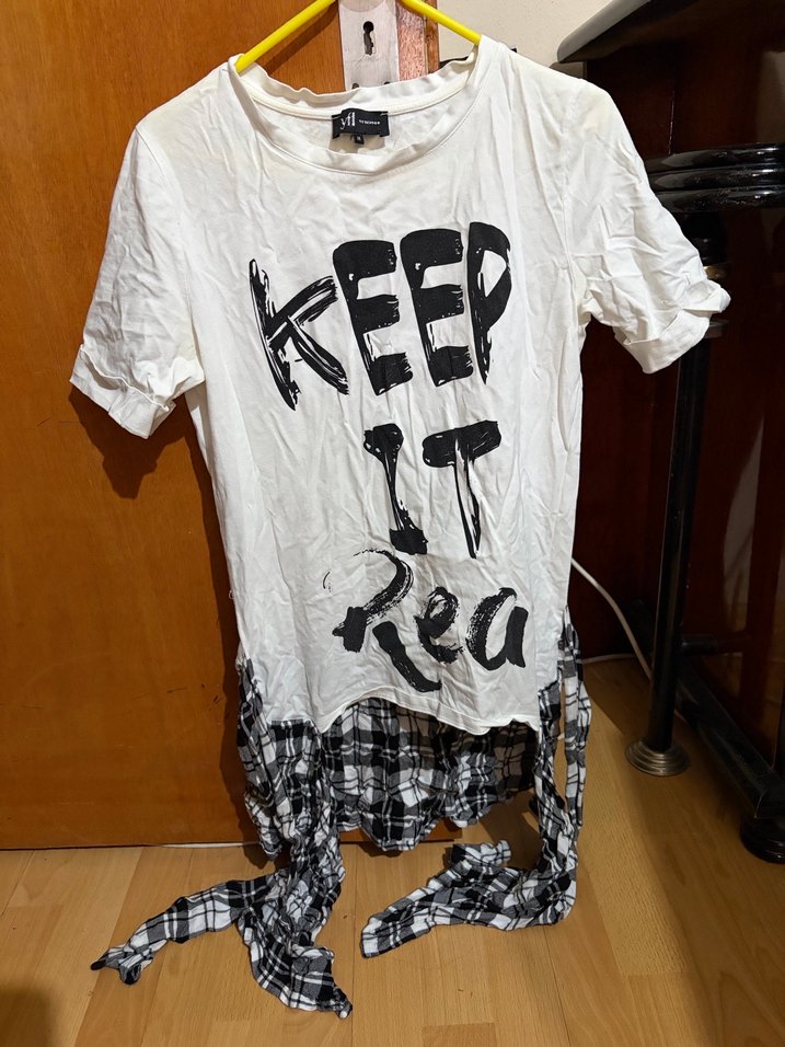 Kısa kollu, halter yaka, beyaz Siyah baskılı, kemerli ve ekose desenli alt kısmı ile gotik tarz