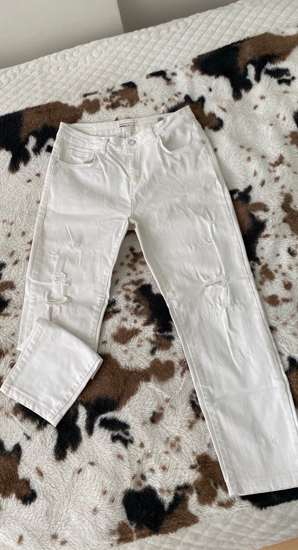 Beyaz, midi boy, yıpranmış detaylara sahip kadın kot pantolon, rahat ve şık sokak stili için uygundur. KOTON FAHRİYE EVCEN İŞBİRLİĞİ