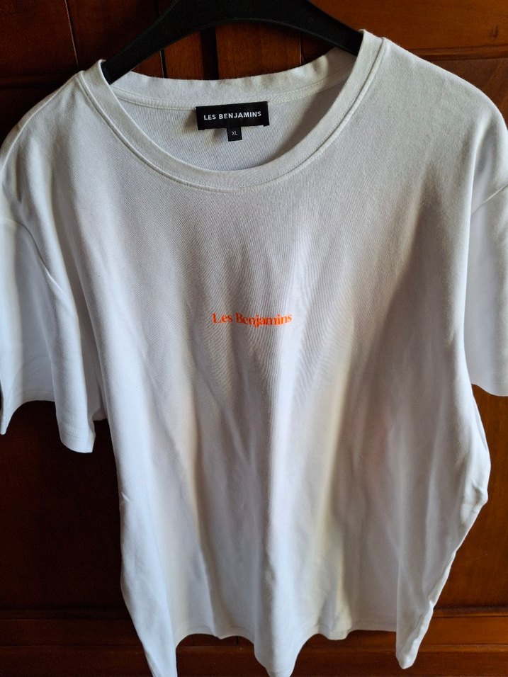 Beyaz renkli, kısa kollu ve yuvarlak yakalı erkek tişörtü. Hafif keten kumaştan, rahat kesim ve 'Les Benjamins' baskılıdır. Hic giyilmedi orijinal