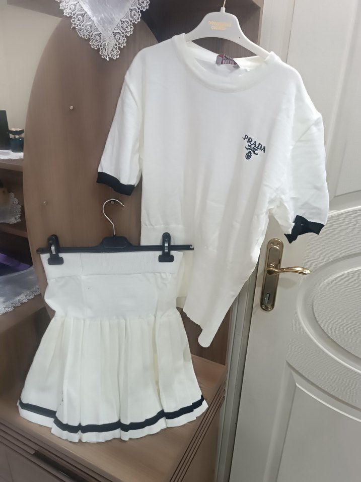 Pamuklu beyaz kız eşofman takımı, loose fit, kısa kollu ve bisiklet yaka. Baskılı detaylar ve siyah şeritlerle rahat sokak stili sunar.