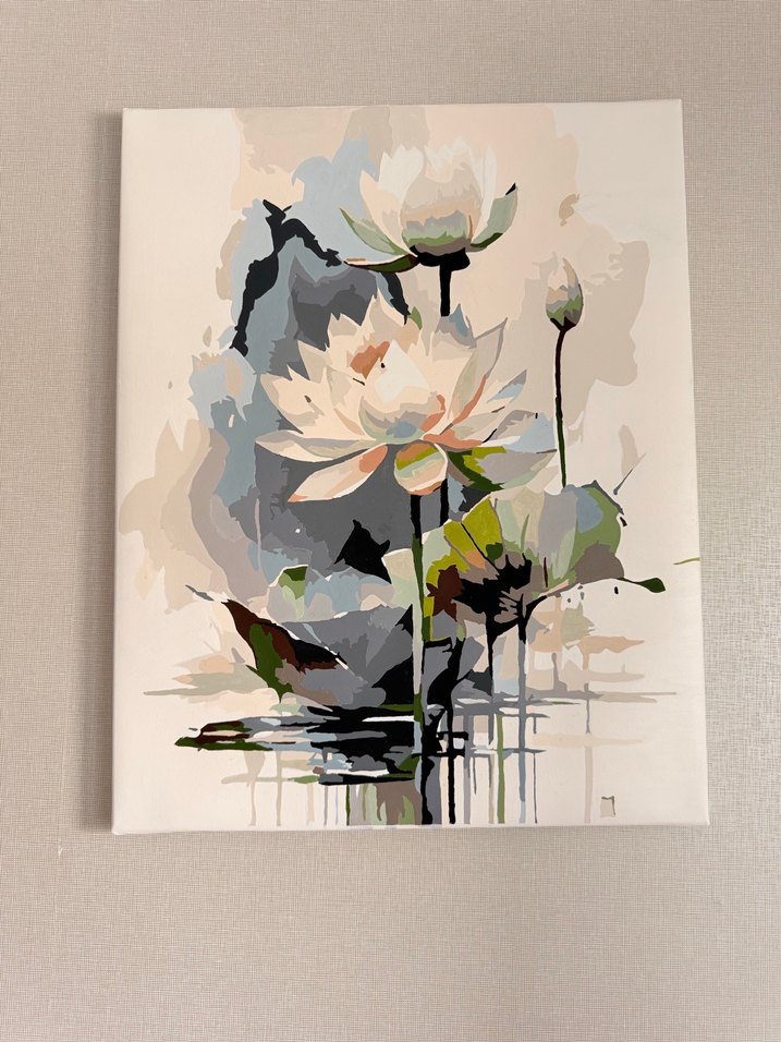 Yumuşak ve açık renklerle beyaz lotus çiçeklerinin resmedildiği sakin ve zarif bir tablo.