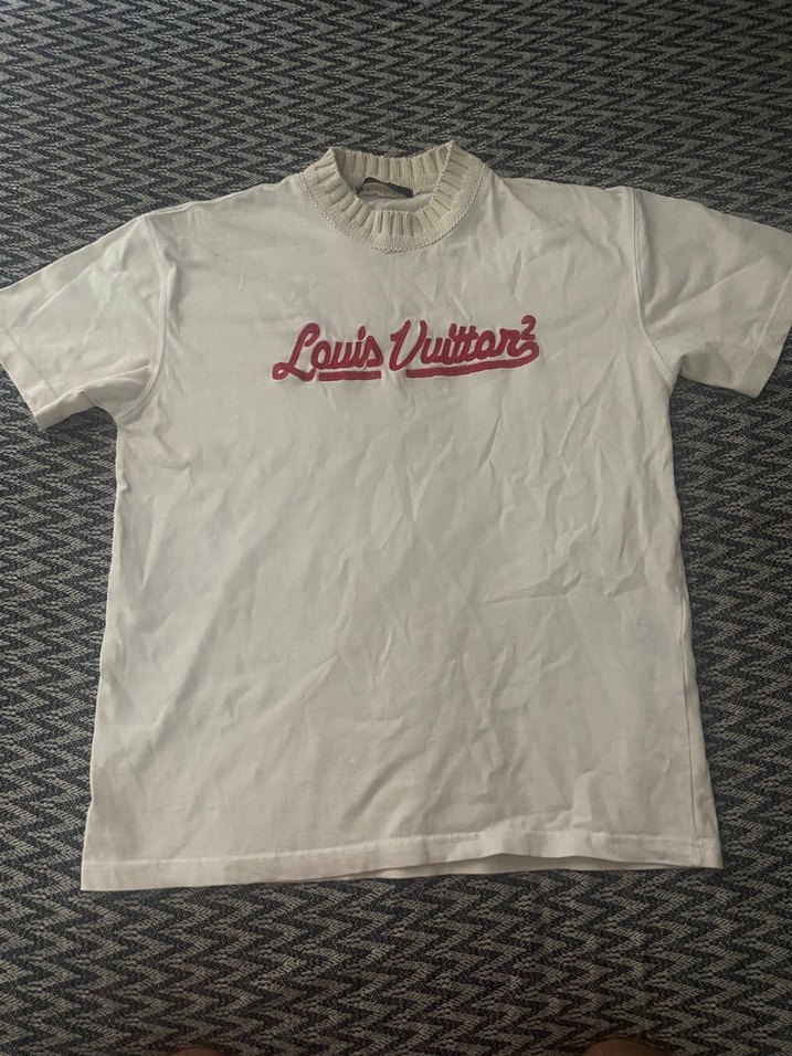 Beyaz kısa kollu, bisiklet yaka tişört, Louis Vuitton baskılı. Yumuşak keten kumaştan, rahat kesim, günlük kullanıma uygun.