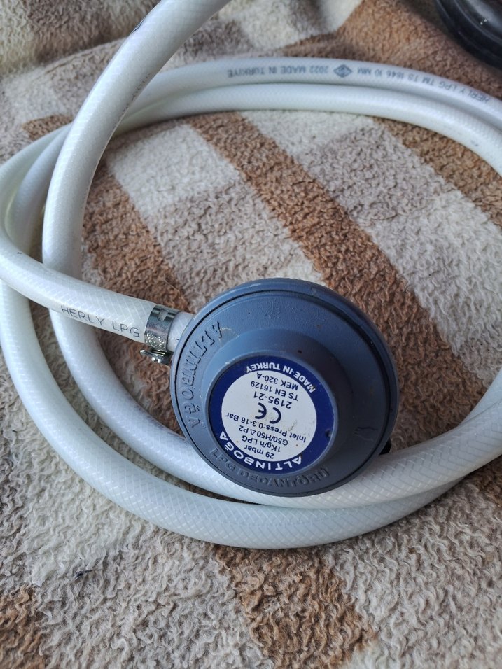 Beyaz renkte LPG gaz regülatörü ve dayanıklı, esnek hortumdan oluşur. Güvenli ve verimli gaz akışı sağlar.