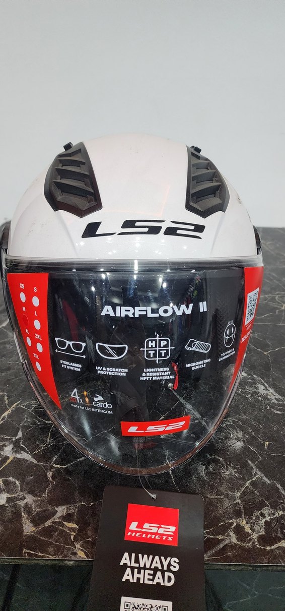 Beyaz LS2 Airflow II motosiklet kaskı, plastik malzemeden üretilmiş, baskılı detaylara ve cırt cırtlı kapanışa sahiptir. UV koruması vardır ve gözlüklü kullanıcılar için uygundur