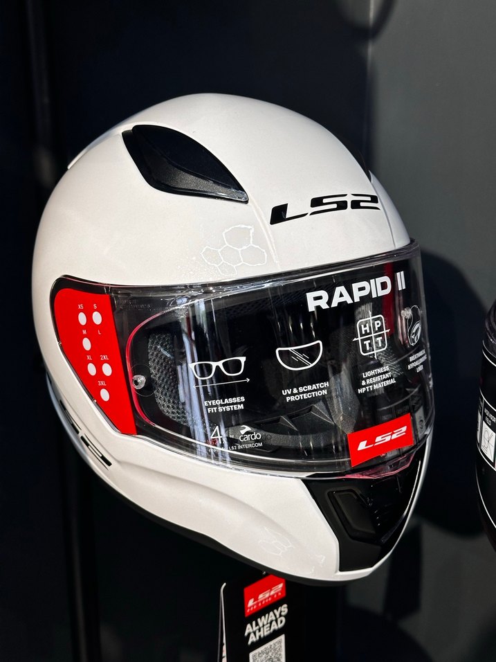 Beyaz LS2 biker kask, renkli baskılı detaylara ve bağcıklı kauçuk malzemeye sahip. UV ve çizilme koruması, gözlük uyum sistemi ve buğu önleyici özellikler bulunur. RAPID II yazılı.
