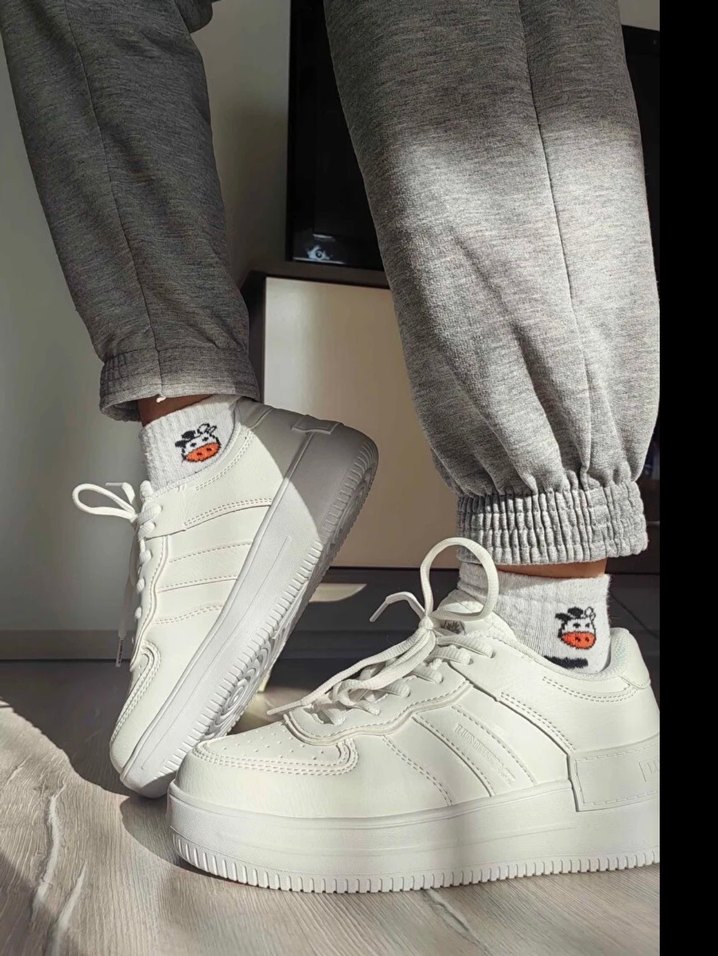 Beyaz platform topuklu kadın spor ayakkabısı, sade tasarımlı ve kauçuk tabanlıdır. Günlük kullanıma uygun, zahmetsiz şıklık sunar.