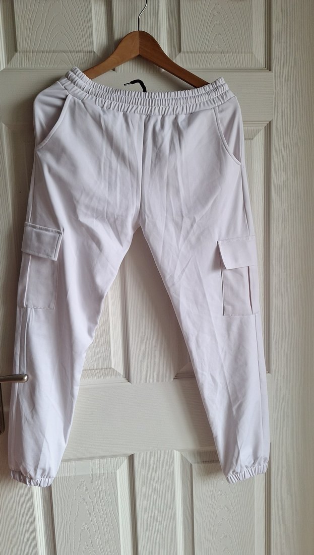Beyaz lycralı, kemerli, bol kesim kadın eşofman altı. Cep detaylı, orta boy ve lastikli paçalı, günlük kullanıma uygun. iç göstermez