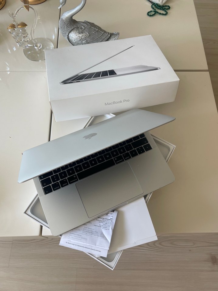 Beyaz MacBook Pro dizüstü bilgisayar, ince tasarımı ve geniş touchpad ile kullanımı rahat sağlar. Orijinal kutusu ve belgeleri ile birlikte gelir.
