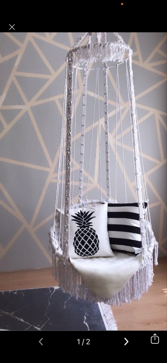 Yumuşak tabanlı beyaz makrome bebek salıncağı, siyah beyaz dekoratif yastıklarla birlikte, sağlam iplerle asılmıştır.
