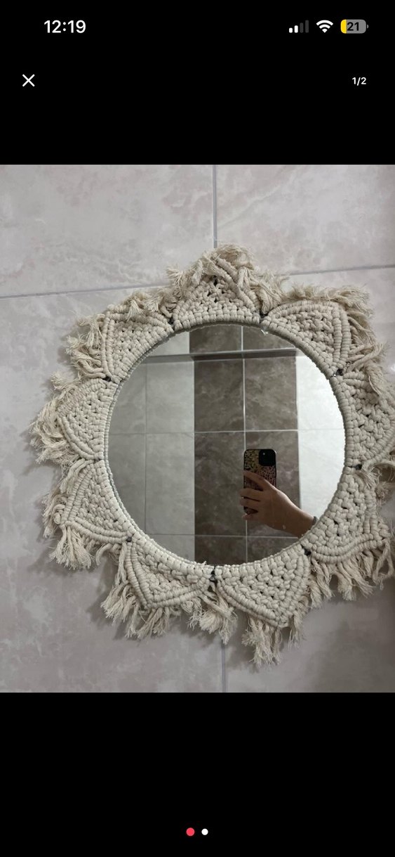Yuvarlak ayna, beyaz makrome çerçevesi ve püsküllü dokusuyla bohem bir hava katıyor.